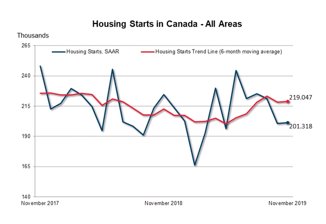 The trend in housing starts was 219,047 units in November 2019, compared to 218,253 units in October 2019, according to Canada Mortgage and Housing Corporation (CMHC). This trend measure is a six-month moving average of the monthly seasonally adjusted annual rates (SAAR) of housing starts.