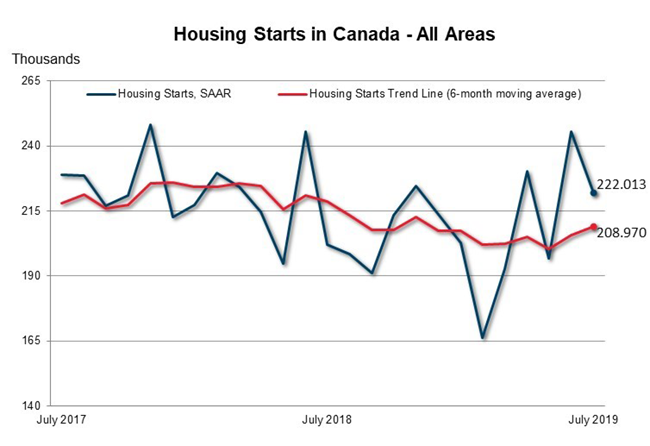 The trend in housing starts was 208,970 units in July 2019, compared to 205,765 units in June 2019, according to Canada Mortgage and Housing Corporation (CMHC). This trend measure is a six-month moving average of the monthly seasonally adjusted annual rates (SAAR) of housing starts.