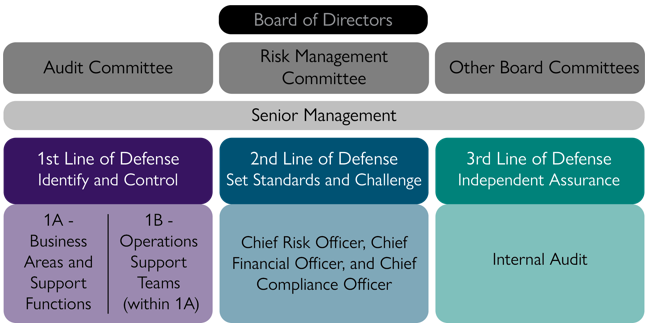 Our Risk Management Framework also includes a risk governance model. This outlines the accountability for risk across the organization. It ensures that every employee at every level plays a role in managing risk — along three lines of defence.