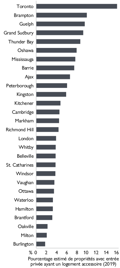 - À Toronto, près d’une habitation avec entrée privée1 sur six comportait un logement accessoire. Il s’agit du taux le plus élevé en Ontario, soit un total estimé de 75 000 logements accessoires.