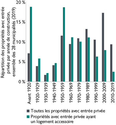 - Les municipalités affichant un fort pourcentage de maisons de plain-pied de construction récente étaient moins susceptibles d’avoir des logements accessoires.