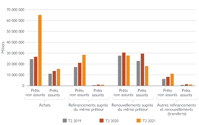 Par rapport à l’année précédente, le volume de nouveaux prêts hypothécaires non assurés s’est accru de 20 %, alors que leur valeur a augmenté de 53 %. Les prêts non assurés occupent donc une part croissante du marché hypothécaire résidentiel. L’augmentation la plus notable a été observée dans l’émission de prêts hypothécaires non assurés pour l’achat de logements, dont le nombre a plus que doublé par rapport au même trimestre en 2020.