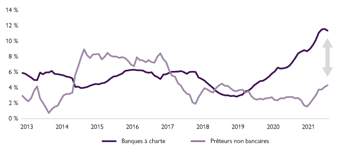 Les prêts hypothécaires consentis par les prêteurs non traditionnels ont connu une légère reprise au deuxième trimestre de 2021. Cette reprise fait suite à un ralentissement important durant la première année de la pandémie, en raison de la montée de l’incertitude et de la demande croissante de rachats de la part des investisseurs. Cette croissance récente repose probablement sur :