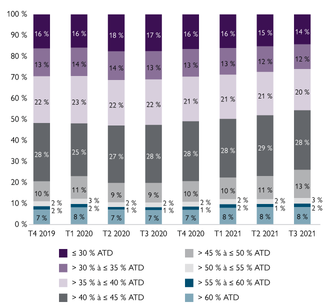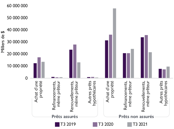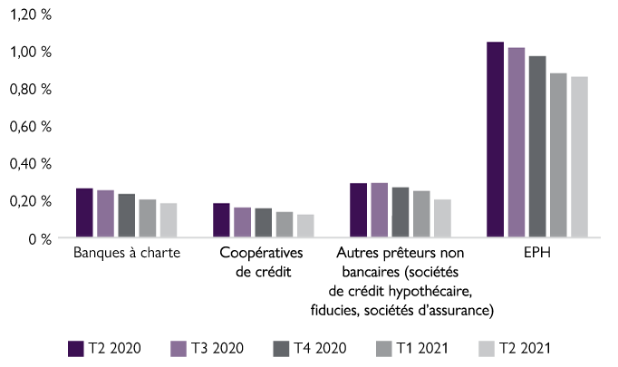 Au deuxième trimestre de 2021, la proportion accrue de prêts hypothécaires de premier rang et la baisse du rapport prêt-valeur sur les nouveaux prêts hypothécaires ont diminué le risque de leur portefeuille. Par ailleurs, la répartition géographique a légèrement changé : la part du Québec est passée de 3,7 à 5,3 %.