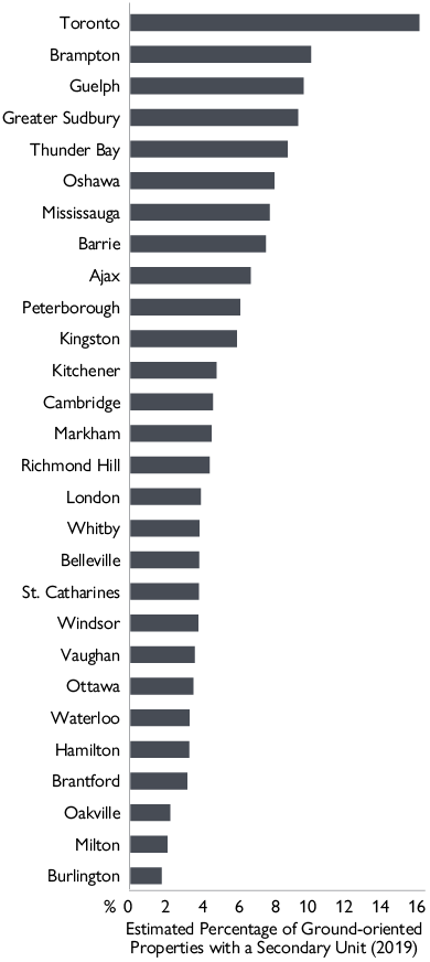 - Nearly 1 out of 6 ground-oriented homes1 in Toronto had a secondary unit. This is the highest ratio in Ontario, totalling an estimated 75,000 secondary units.