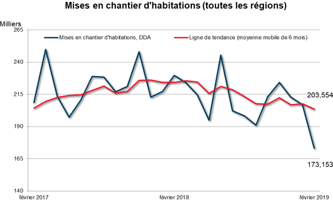 La tendance des mises en chantier d’habitations s’est chiffrée à 203 554 en février 2019, après s’être établie à 207 742 en janvier, selon la Société canadienne d’hypothèques et de logement (SCHL). Cette tendance correspond à la moyenne mobile de six mois du nombre mensuel désaisonnalisé et annualisé (DDA) de mises en chantier d’habitations.