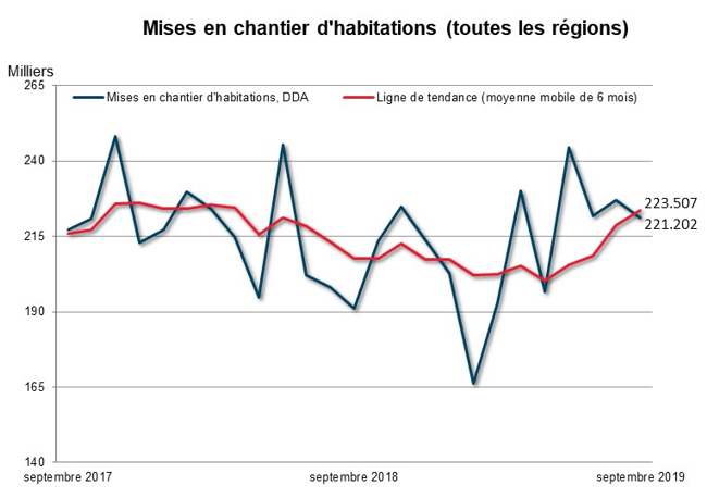 La tendance des mises en chantier d’habitations s’est chiffrée à 223 507 en septembre 2019, comparativement à 218 782 en août 2019, selon la Société canadienne d’hypothèques et de logement (SCHL). Cette tendance correspond à la moyenne mobile de six mois du nombre mensuel désaisonnalisé et annualisé (DDA) de mises en chantier d’habitations.